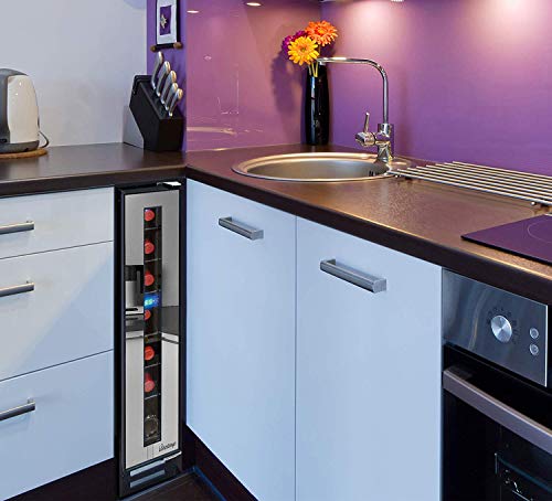 This Vinotemp 7-Bottle Mini Wine Cooler Fridge is another option on the smaller side, but entirely unique. This narrow wine fridge stacks the bottles one on top of another to create its slim shape. A tall thin wine fridge has many advantages. It can be used as a built-in, under the cabinet wine fridge or can be used freestanding. This thin wine fridge fits within tight, narrow spaces making it ideal for smaller apartments.