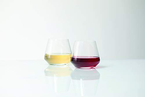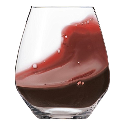 This stemless wine glass set comes with six 15 ounce glasses. The set is made specifically for Burgundy wine, but Schott Zwiesel also produces a stemless Bordeaux style, which is a little taller and can be used for white wine as well. Both sets of stemless red wine glasses make the perfect gift.